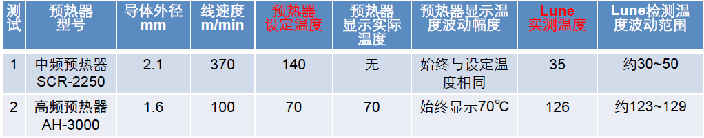 2.高頻預(yù)熱器AH-3000溫度設(shè)定值(70℃)與其顯示的實(shí)際值(70℃)相同,但是與Lune測(cè)溫儀實(shí)測(cè)值(126℃)偏差較大,現(xiàn)場(chǎng)反饋導(dǎo)體發(fā)生斷裂情況較多,可能是預(yù)熱實(shí)際溫度過(guò)高導(dǎo)致。