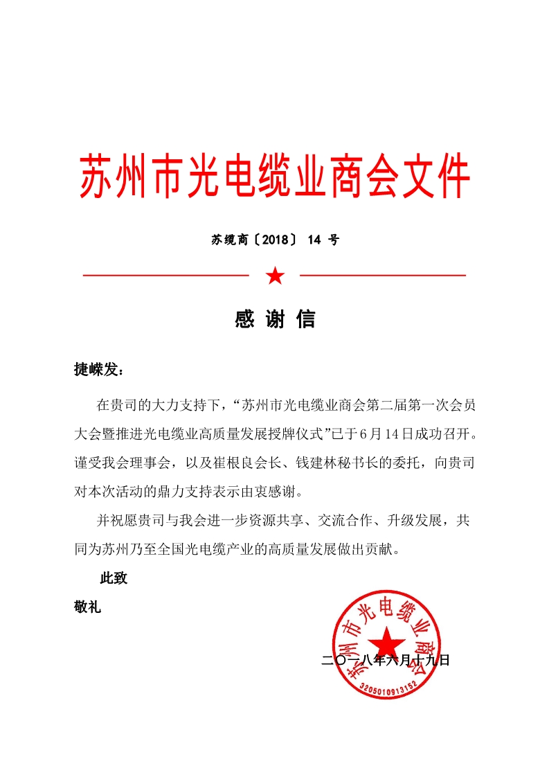 會議以“新時代、新征程、新使命”為口號,以“搶抓新時代機(jī)遇、聚優(yōu)高質(zhì)量發(fā)展”為主題展開匯報,會議結(jié)束后,捷嶸發(fā)收到來著蘇州光電纜商會的感謝信: