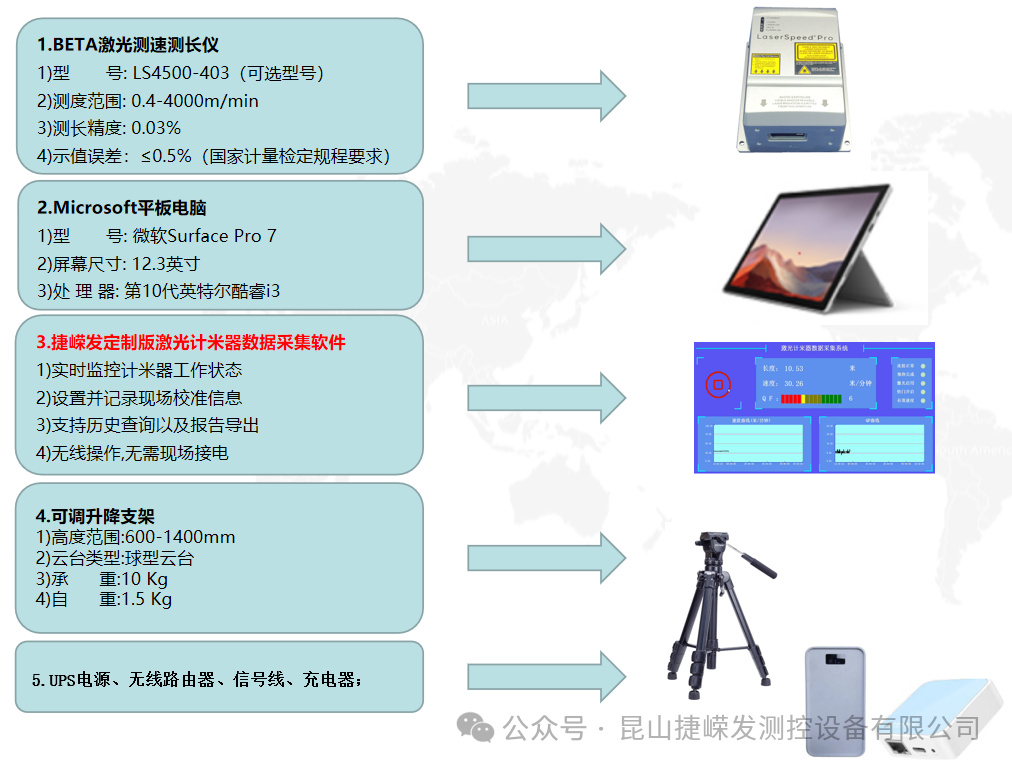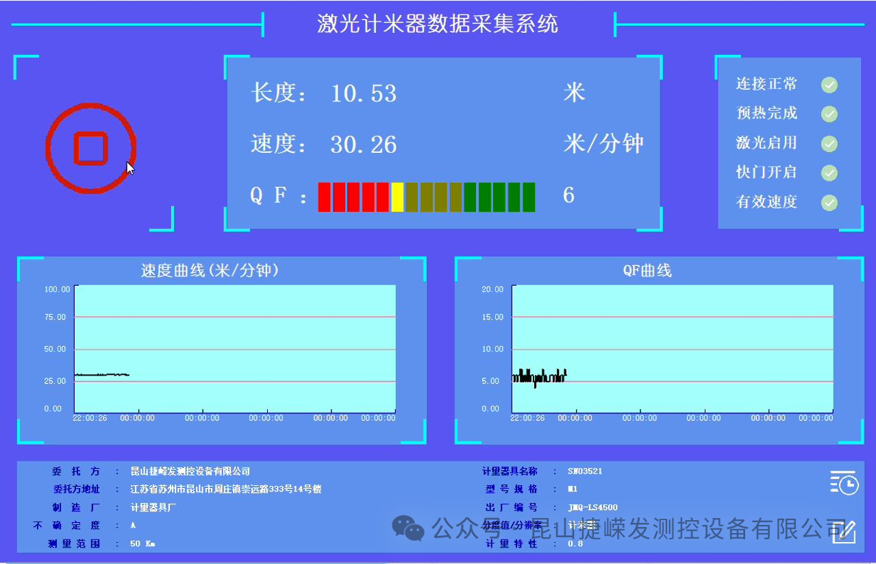 該系統(tǒng)主要由昆山捷嶸發(fā)測控設(shè)備有限公司生產(chǎn)的軟硬件系統(tǒng)和國際知名制造商BETA LaserMike生產(chǎn)的激光計米器配套組成,是一款高精度的非接觸式測量速度和長度的儀表系統(tǒng),通過無線數(shù)據(jù)傳輸將測量結(jié)果發(fā)送給軟件系統(tǒng)并呈現(xiàn)給操作者。
