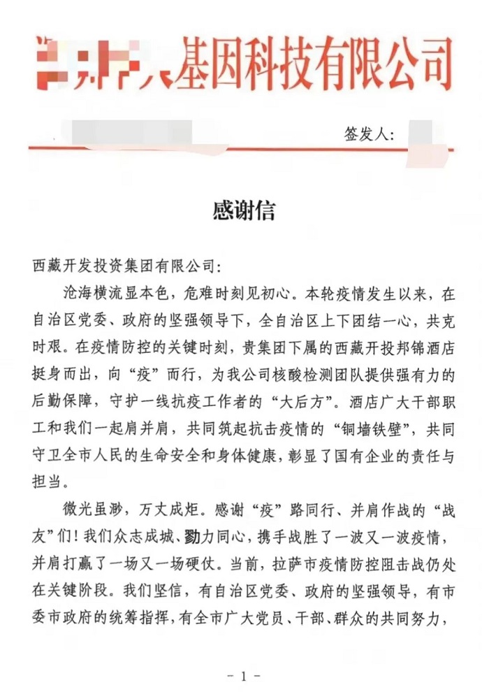 該核酸檢測(cè)機(jī)構(gòu)總部在感謝信中表示,本輪疫情發(fā)生以來,在自治區(qū)黨委、政府的堅(jiān)強(qiáng)領(lǐng)導(dǎo)下,全區(qū)上下團(tuán)結(jié)一心,共克時(shí)艱。在疫情防控的關(guān)鍵時(shí)刻,西藏開投邦錦花園酒店挺身而出,向“疫”而行,為該核酸檢測(cè)機(jī)構(gòu)的核酸檢測(cè)團(tuán)隊(duì)提供強(qiáng)有力的后勤保障,守護(hù)一線抗疫工作者的“大后方”。酒店廣大干部職工和我們一起肩并肩,共同筑起抗擊疫情的“銅墻鐵壁”,共同守衛(wèi)全市人民的生命安全和身體健康,彰顯了國有企業(yè)的責(zé)任與擔(dān)當(dāng)。