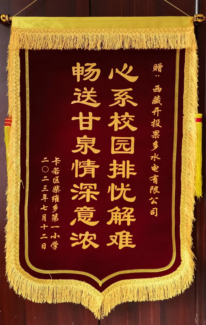 捐贈現(xiàn)場,果多水電公司董事長、總經(jīng)理宋亞東與校長李松林親切交流,了解孩子們學習、生活情況,鼓勵孩子們要好好學習,保持樂觀向上的心態(tài),健康快樂成長。作為受助方,李松林向果多水電公司贈送“心系校園排憂解難 暢送甘泉情深意濃”錦旗以表謝意。他表示,愛心無價,情誼永恒,全校師生將把這份關(guān)愛化作砥礪前行的動力,努力提高柴維鄉(xiāng)教育教學質(zhì)量,培養(yǎng)出德、智、體、美、勞全面發(fā)展的新時代好少年。