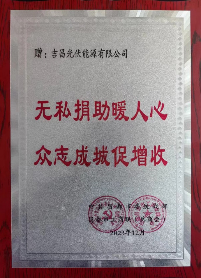 4月26日,中共昌都市委統(tǒng)戰(zhàn)部、昌都市工商聯(lián)(總商會)聯(lián)合授予西藏開投吉昌光伏能源有限公司“無私捐助暖人心 眾志成城促增收”榮譽(yù)獎(jiǎng)牌,對公司充分發(fā)揮典型示范帶動效應(yīng),有效增強(qiáng)“萬企興萬村”促增收、“百企幫百戶”等活動影響力和凝聚力,為昌都市鄉(xiāng)村振興貢獻(xiàn)企業(yè)力量予以肯定和鼓勵(lì)?!?/div>