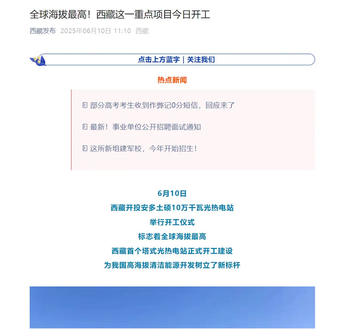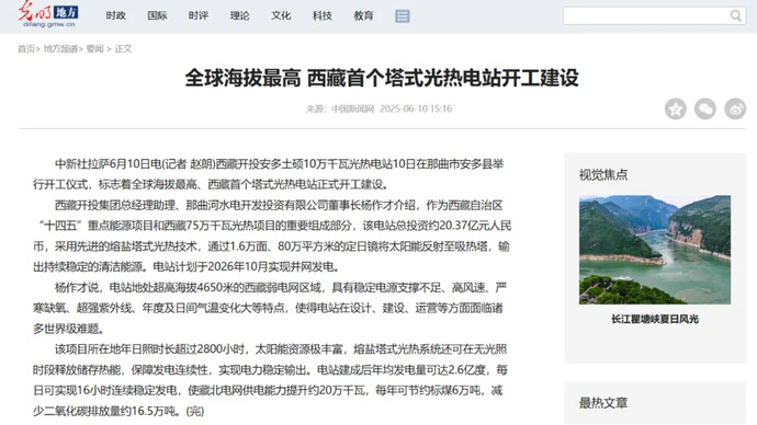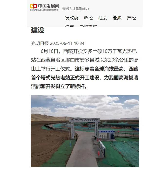 媒體報道丨全球海拔最高、西藏首個塔式光熱電站開工建設