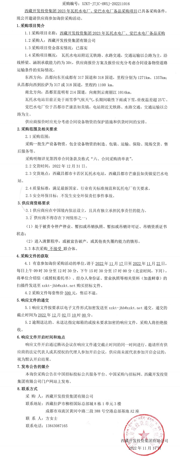 西藏開發(fā)投資集團(tuán)2023年瓦托水電廠、覺(jué)巴電廠備品采購(gòu)公告