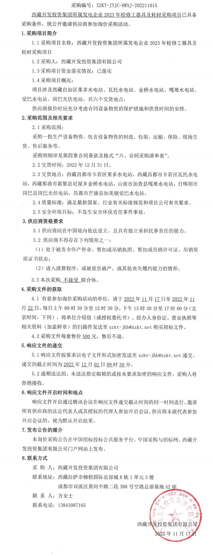 西藏開發(fā)投資集團(tuán)所屬發(fā)電企業(yè)2023年檢修工器具及耗材公告