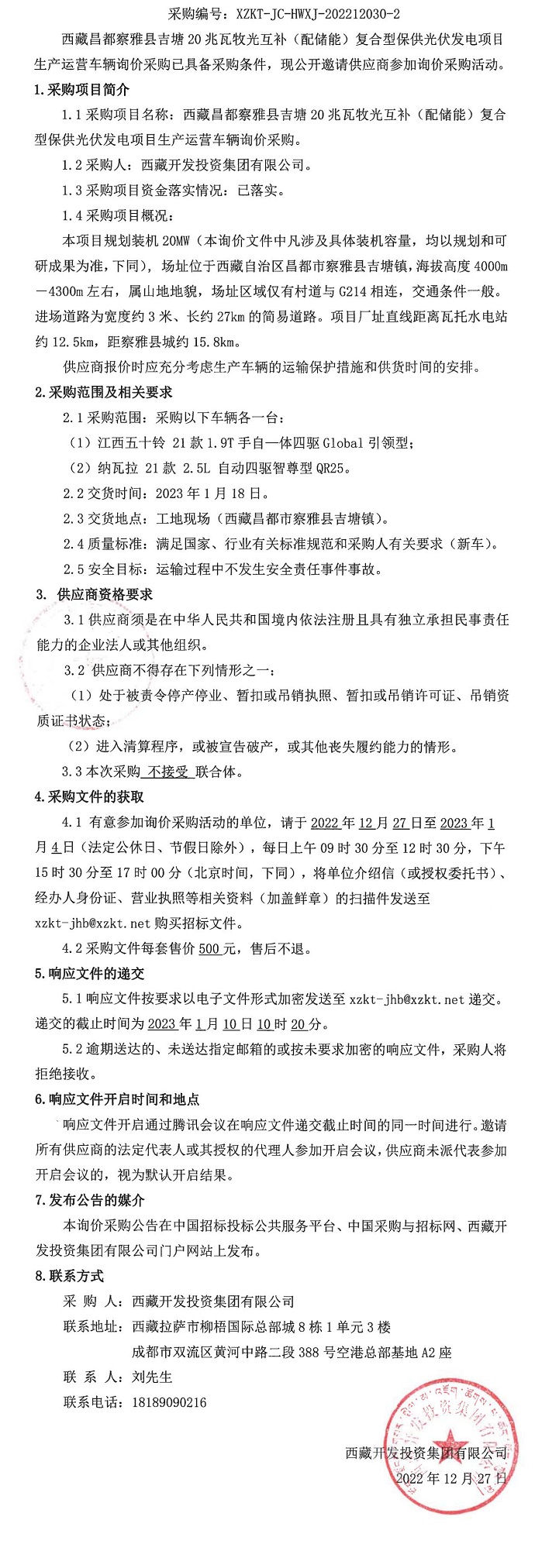 西藏昌都察雅縣吉塘20兆瓦牧光互補(bǔ)(配儲能)復(fù)合型保供光伏發(fā)電項(xiàng)目生產(chǎn)運(yùn)營車輛詢價(jià)采購二次公告