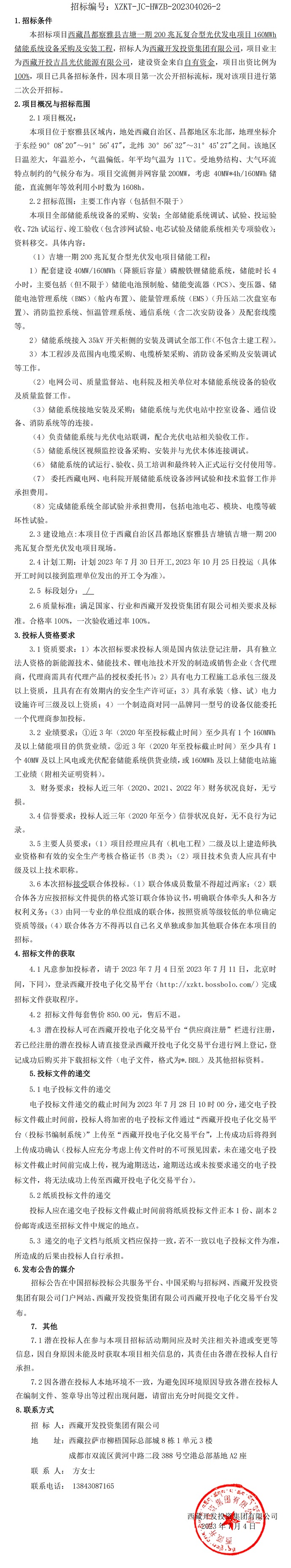 西藏昌都察雅縣吉塘一期200兆瓦復合型光伏發(fā)電項目160MWh儲能系統(tǒng)設備采購及安裝工程招標公告(第二次)