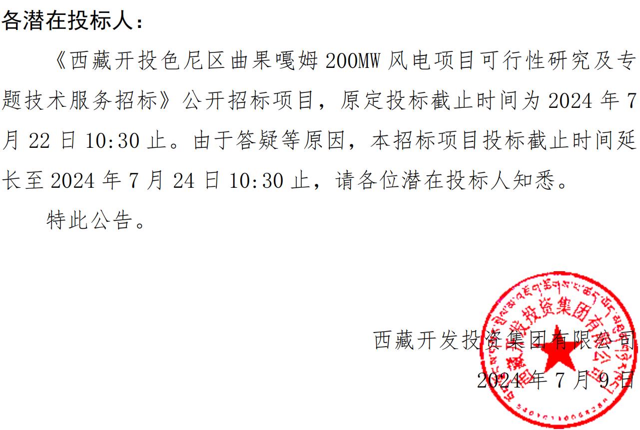 關(guān)于延長《西藏開投色尼區(qū)曲果嘎姆200MW風(fēng)電項(xiàng)目可行性研究及專題技術(shù)服務(wù)招標(biāo)》投標(biāo)截止時間的公告