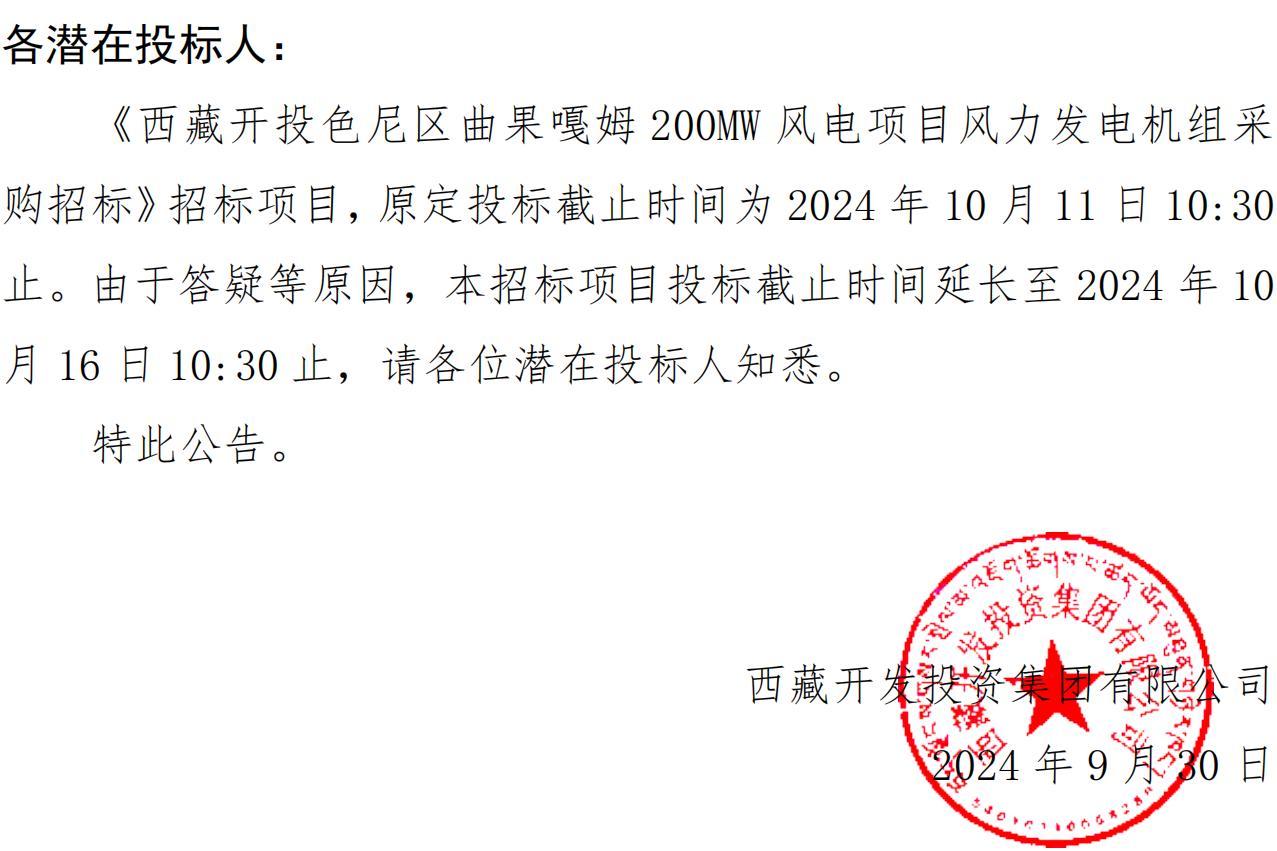關(guān)于延長《西藏開投色尼區(qū)曲果嘎姆200MW風(fēng)電項(xiàng)目風(fēng)力發(fā)電機(jī)組采購招標(biāo)》投標(biāo)截止時(shí)間的公告