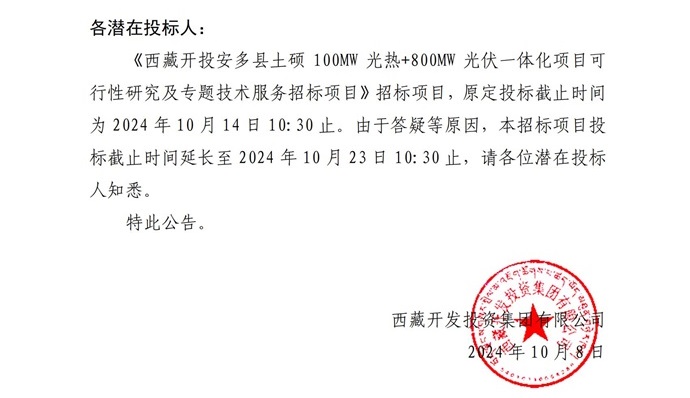 關(guān)于延長《西藏開投安多縣土碩100MW光熱+800MW光伏一體化項目可行性研究及專題技術(shù)服務(wù)招標(biāo)項目》投標(biāo)截止時間的公告