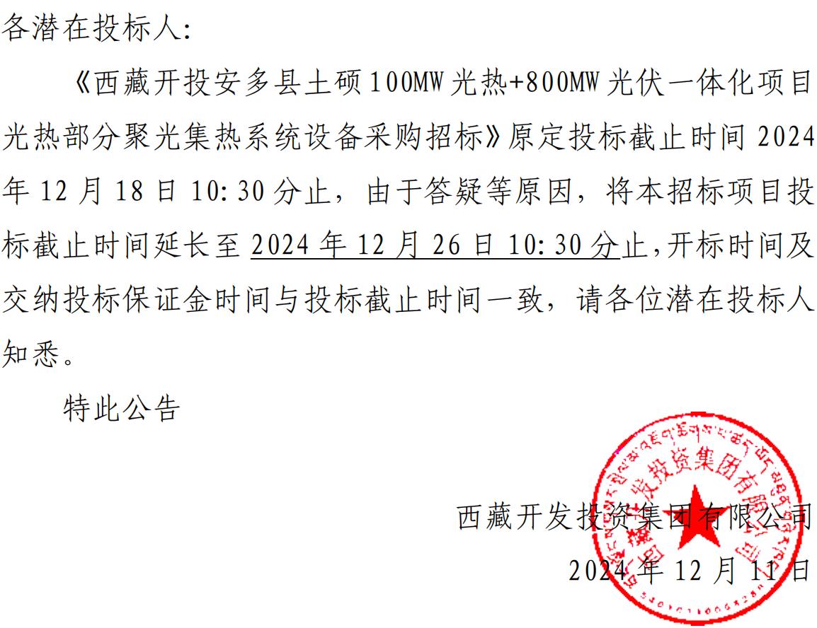 關(guān)于延長《西藏開投安多縣土碩100MW光熱+800MW光伏一體化項(xiàng)目光熱部分聚光集熱系統(tǒng)設(shè)備采購招標(biāo)》投標(biāo)截止時(shí)間的公告