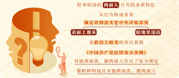 陽奉陰違的兩面人行為的本質特征,從行為構成來說,就是貫徹落實黨中央決策部署表面上遵從,暗地里違抗,是政治上蛻變的突出表現。