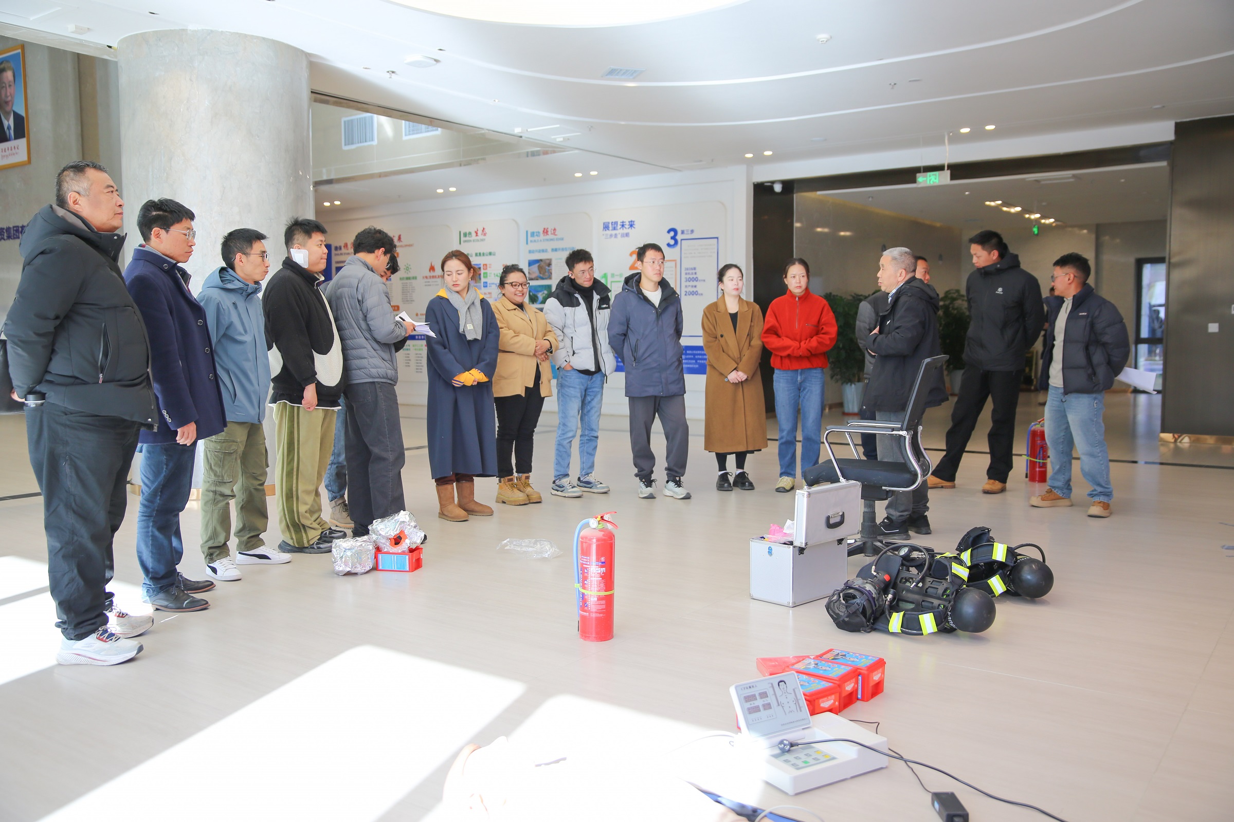 在“實(shí)操實(shí)訓(xùn)”環(huán)節(jié),技能訓(xùn)練分區(qū)域同步開(kāi)展:急救技能區(qū)聚焦高原環(huán)境特點(diǎn),開(kāi)展心肺復(fù)蘇與創(chuàng)傷包扎專(zhuān)業(yè)指導(dǎo)訓(xùn)練;安全防護(hù)裝備區(qū)強(qiáng)化正壓式空氣呼吸器、防毒面具等裝備的規(guī)范使用訓(xùn)練;消防實(shí)訓(xùn)區(qū)則組織滅火器與滅火毯分組實(shí)操,全面提升員工應(yīng)急處置能力。