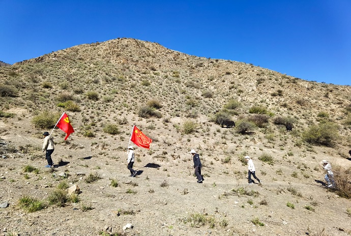 此次踏勘全程22公里,海拔垂直高度1200米。9時(shí)30分,新能源公司踏勘人員肩抗黨旗、國(guó)旗,背負(fù)測(cè)量設(shè)備和儀器從山腳沿項(xiàng)目進(jìn)場(chǎng)道路出發(fā)。在徒步上山過程中,天氣炙烤灼人,大家三五隨群,或健步直沖或駐足而立,或仔細(xì)測(cè)量或落筆記錄,或討論工作或抒懷暢想。大家互相幫助、互相鼓勁,隨著海拔的不斷攀升,身體負(fù)重不斷加大,氣息開始急促、腳步不再有力,每前進(jìn)一步都特別的困難,但眼前的大山壯闊雄渾,遠(yuǎn)處的冰川雪景圣潔空靈,頭頂?shù)奶炜照克{(lán)纖塵不染,讓大家心曠神怡,真切感受到高度是一種境界,攀登是一種追求,是一種“小天下”的胸懷和氣魄!