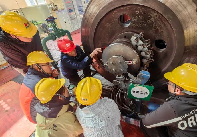 新員工在檢修現(xiàn)場(chǎng)了解水輪發(fā)電機(jī)組系統(tǒng)布置。