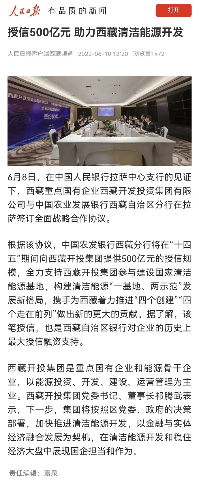 ?。ň幷甙矗?月10日,《人民日報(bào)》客戶端西藏頻道報(bào)道了《授信500億元 助力西藏清潔能源開發(fā)》?!段鞑厝請?bào)》2022年6月10日在第2版“高原要聞”欄目刊登文章,報(bào)道《授信500億元|西藏開投集團(tuán)與中國農(nóng)發(fā)行西藏分行簽訂全面戰(zhàn)略合作協(xié)議》。西藏電視臺2022年6月10日在西藏電視臺影視文化頻道《今晚九點(diǎn)》欄目報(bào)道了《授信500億元|西藏開投集團(tuán)與中國農(nóng)發(fā)行西藏分行簽訂全面戰(zhàn)略合作協(xié)議》,《珠峰云》平臺同步播放。新華網(wǎng)、經(jīng)濟(jì)日報(bào)、西藏衛(wèi)視、西藏日報(bào)客戶端、網(wǎng)信西藏、今日頭條等媒體均報(bào)道了相關(guān)新聞。全文如下: