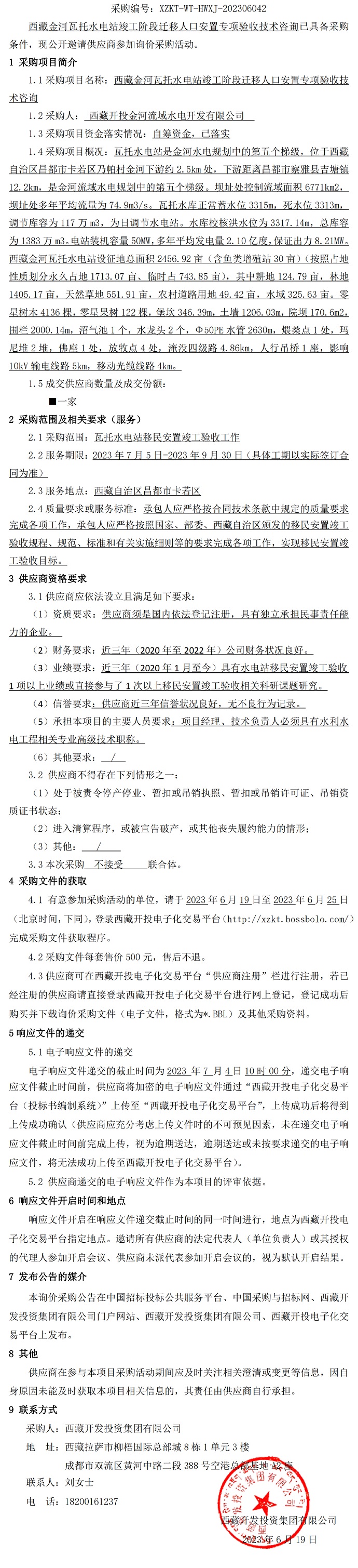 西藏金河瓦托水電站竣工階段遷移人口安置專項(xiàng)驗(yàn)收技術(shù)咨詢詢價(jià)采購公告