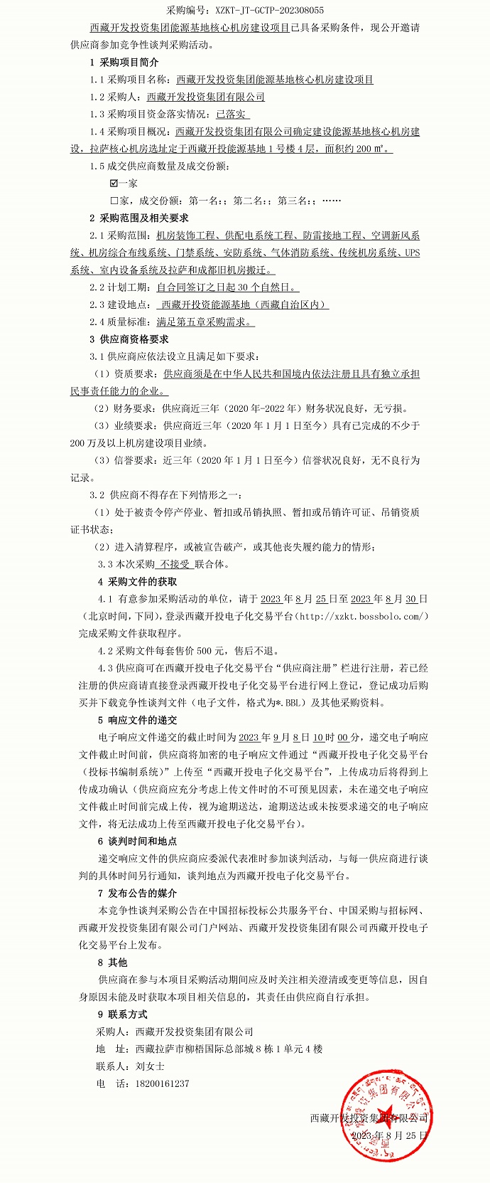 西藏開(kāi)發(fā)投資集團(tuán)拉薩能源基地核心機(jī)房建設(shè)項(xiàng)目談判公告