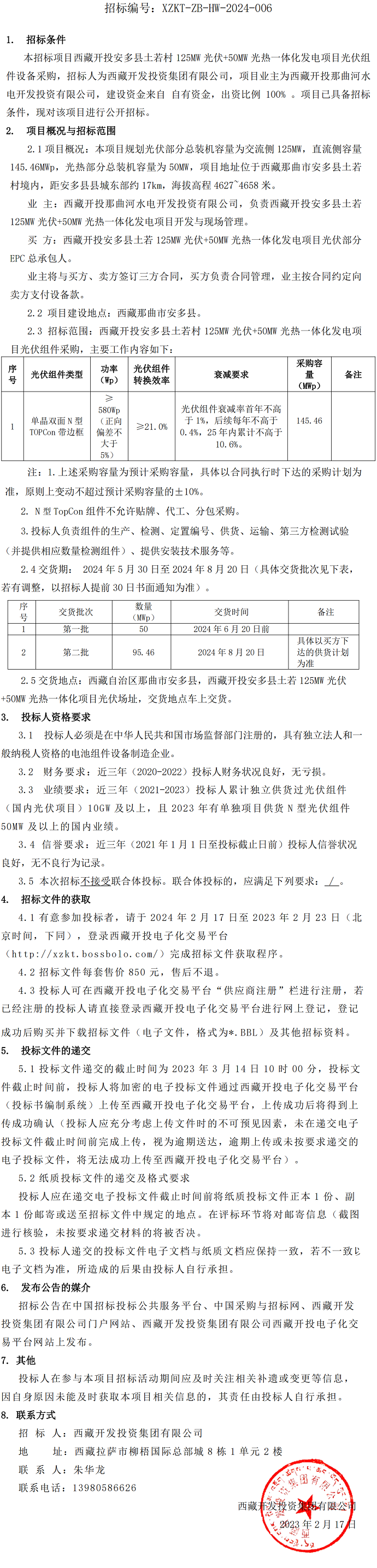西藏開(kāi)投安多縣土若村125MW光伏+50MW光熱一體化發(fā)電項(xiàng)目光伏組件設(shè)備采購(gòu)招標(biāo)公告