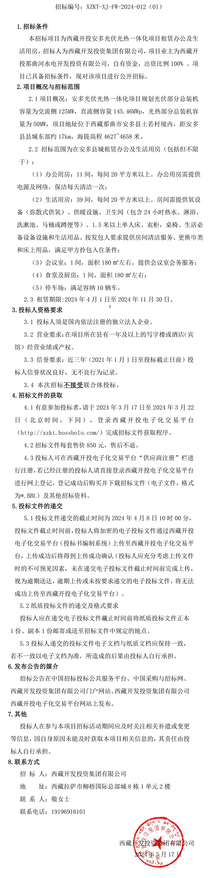西藏開投安多光伏光熱一體化項目租賃辦公及生活用房公告