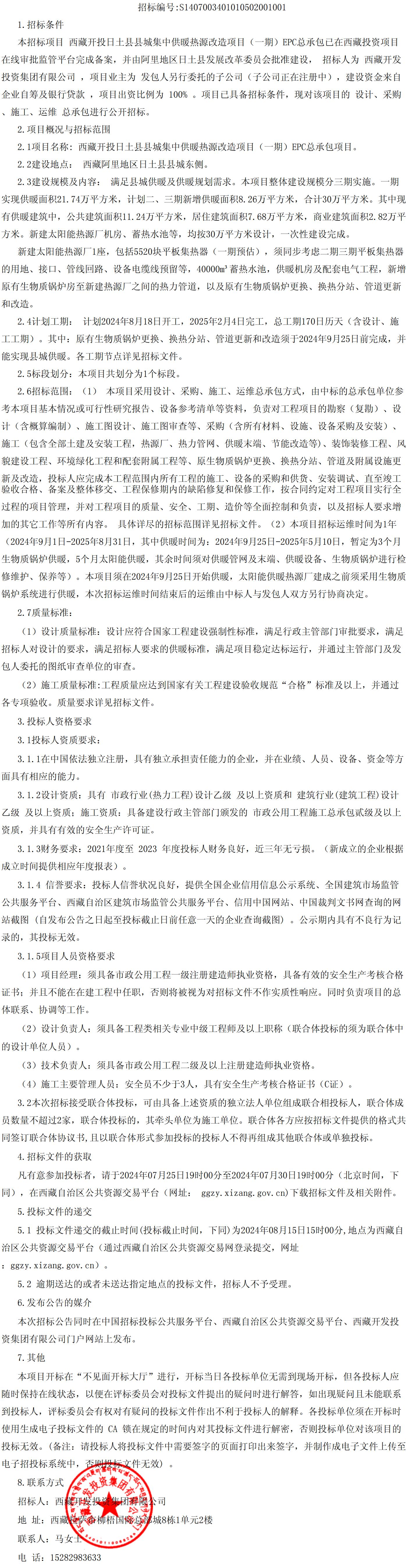西藏開投日土縣縣城集中供暖熱源改造項目(一期)EPC總承包招標(biāo)項目招標(biāo)公告