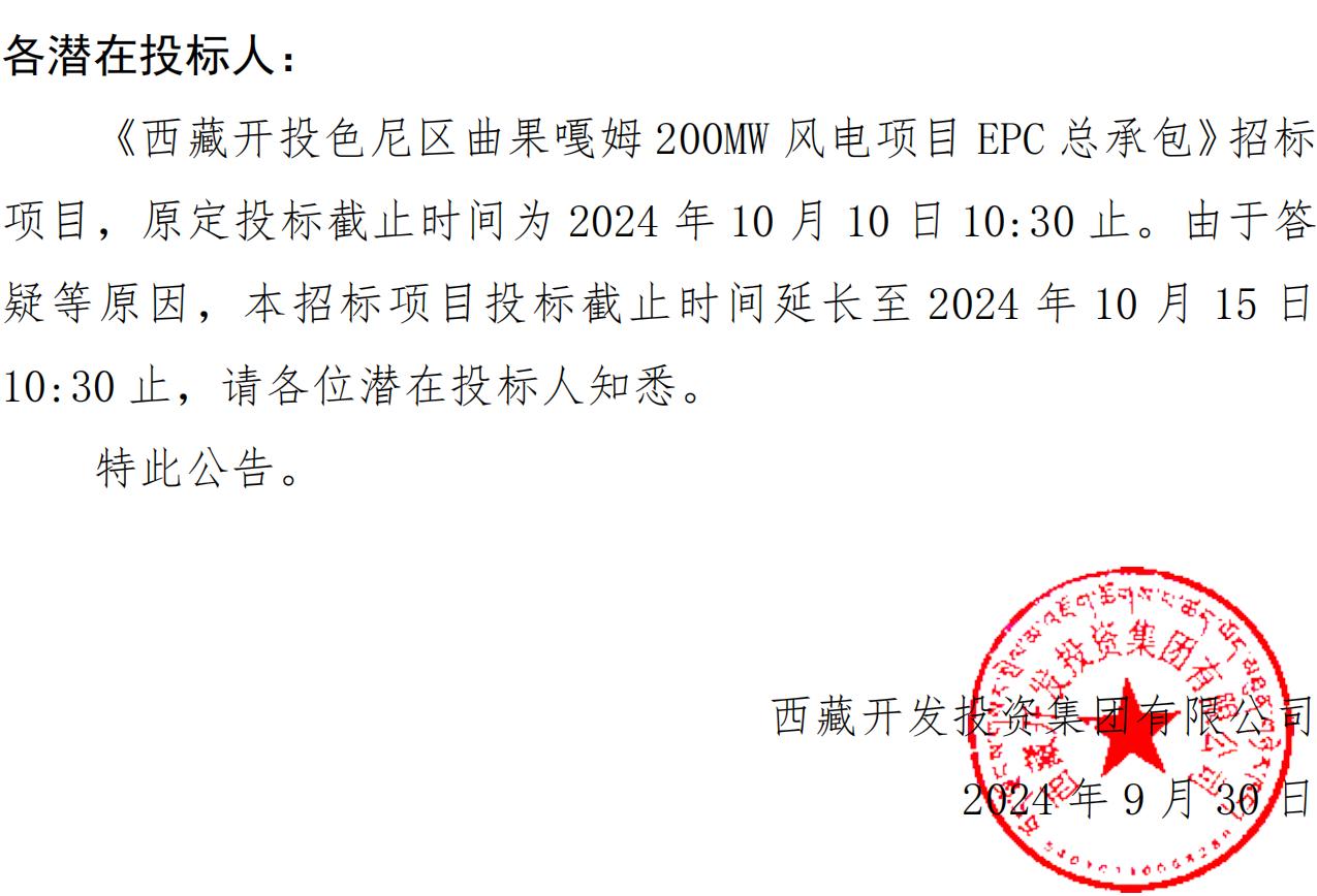 關(guān)于延長《西藏開投色尼區(qū)曲果嘎姆200MW風(fēng)電項(xiàng)目EPC總承包》投標(biāo)截止時(shí)間的公告