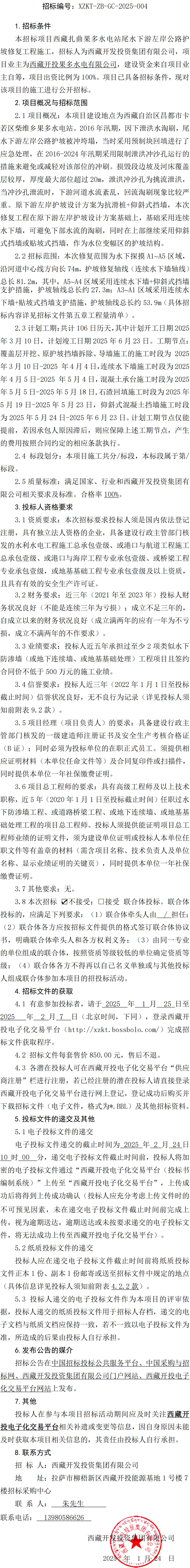 西藏扎曲果多水電站尾水下游左岸公路護(hù)坡修復(fù)工程施工招標(biāo)公告